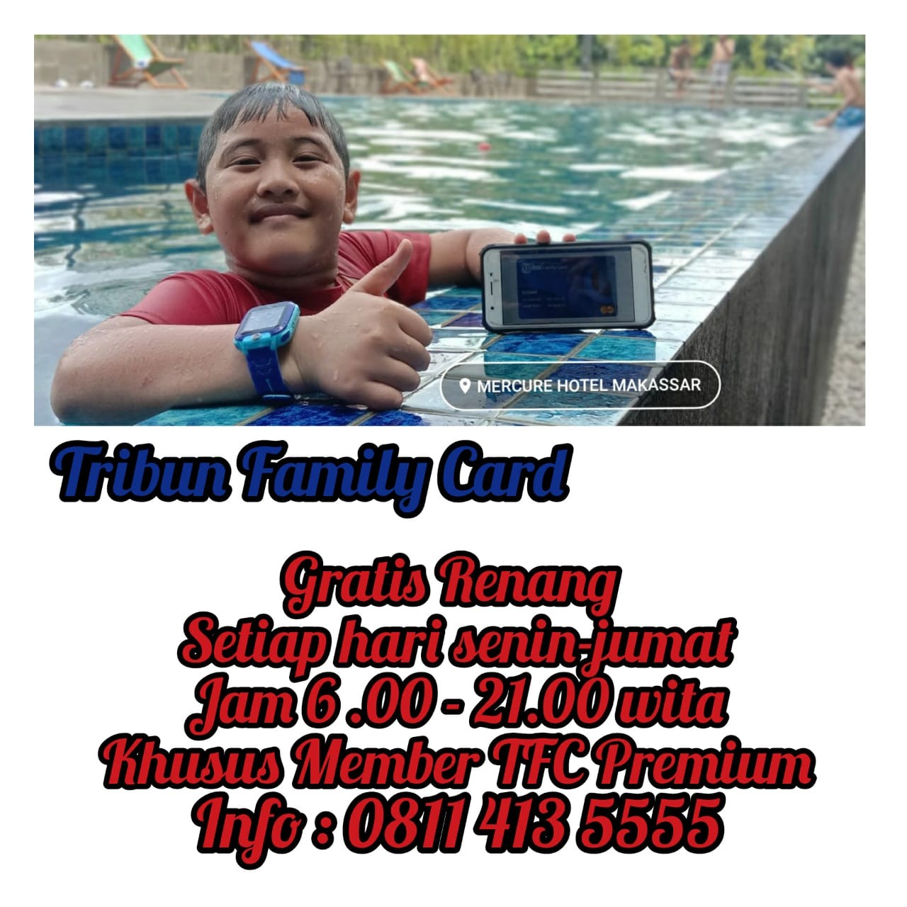 Fasilitas berlaku setiap hari Senin-jumat pukul 06.00-21.00 wita dengan menunjukkan KTP/SIM Anda. Dan jangan lupa perlihatkan aplikasi tribun family card di ponsel anda