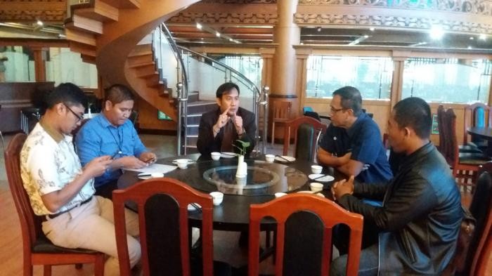Sebelum acara penandatanganan dilangsungkan, GM Hotel Kapuas Palace dan Jajaran Pimpinan Tribun Pontianak, bercengkrama sambil minum teh hangat.