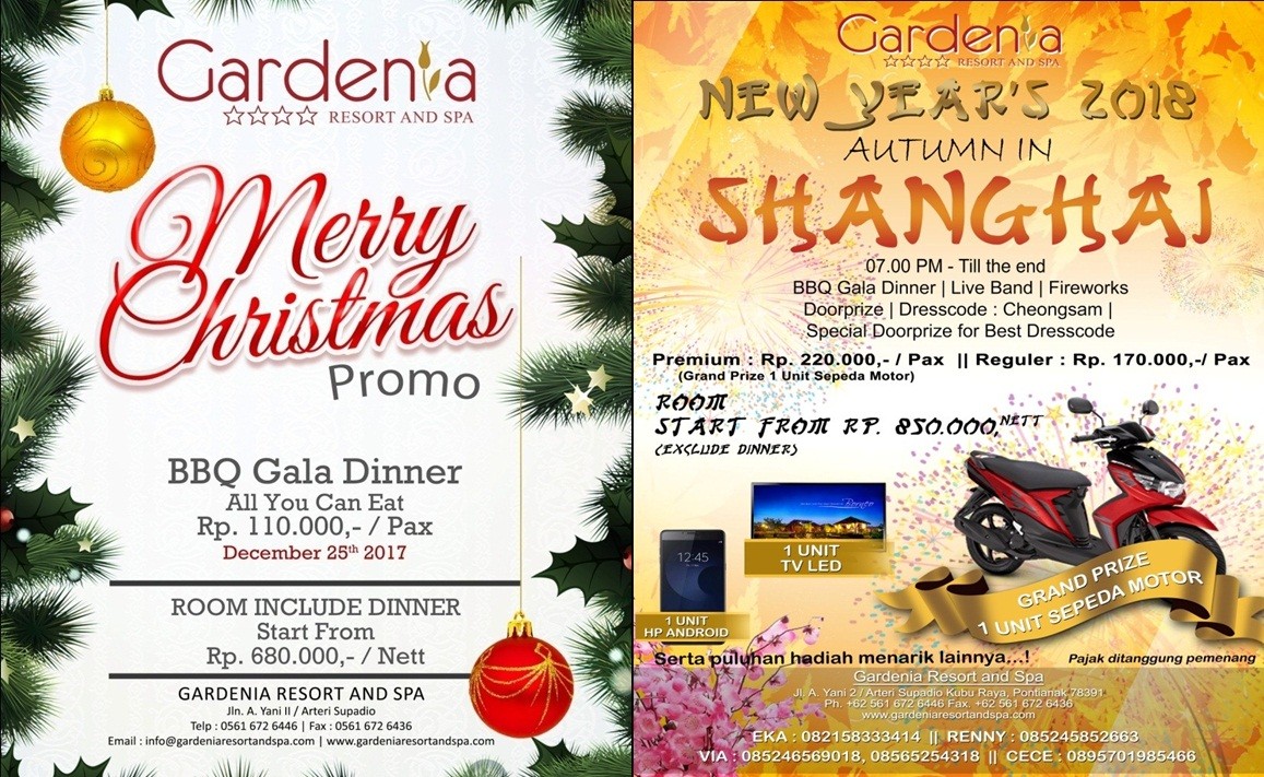 Di penghujung tahun, perayaan Malam Pergantian Tahun menuju 2018, Gardenia Resort and Spa mempersembahkan “New Year 2018 bertajuk Autumn In Shanghai Gala Dinner. Acara akan dimeriahkan oleh Live Music, Fireworks Party, Pelepasan Lampion, Grandprize serta berbagai macam Doorprize menarik lainnya. Hanya dengan Rp 220.000/pax nett anda berkesempatan untuk membawa pulang 1 unit sepeda motor sebagai Grand Prize. Harga Promo kamar mulai dari Rp 850.000 nett.