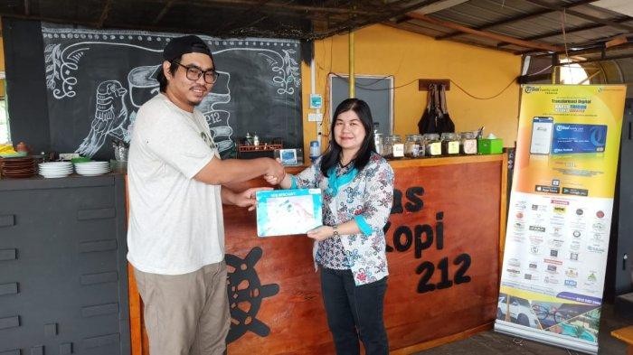 Owner Tempias Kopi 212, Arif (kiri) berjabat tangan dengan GM Business Tribun Pontianak Julia Lorrains usai melakukan MoU merchant TFC, Jumat (25/1/2019).