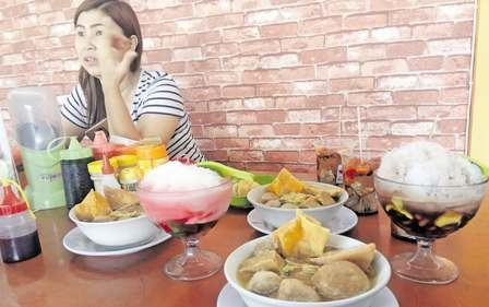 Selain bakso yang menjadi menu utama, rumah makan ini juga menyiapkan pentol yang dicampur dengan pangsit dan tahu goreng, kemudian dilumuri dengan bumbu kacang.
