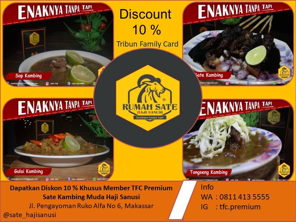 Khusus member TFC Premiun Rumah Sate Kambing Muda Haji Sanusi cabang pankkukang kota Makassar, telah bekerjasama menjadi sala satu merchant TFC Premium dengan memberikan discount 10 % setiap pengguna member TFC Premium yang datang langsung untuk menikmati menu andalan dari rumah makan tersebut.
