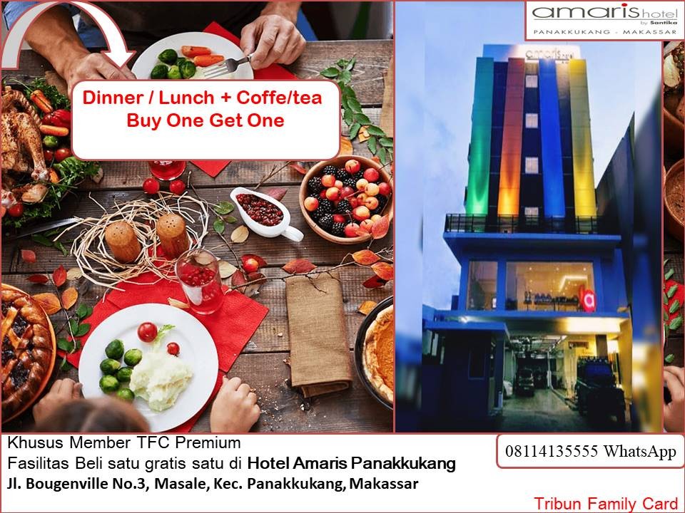 Amaris Hotel Panakkukang telah bergabung menjadi sala satu merchant Tribun Family Card memberikan fasilitas untuk Dinner / Lunch di hotel dengan promo buy one get one free. Dan promo harga khusus kamar Rp. 300.000.- include breakfash.