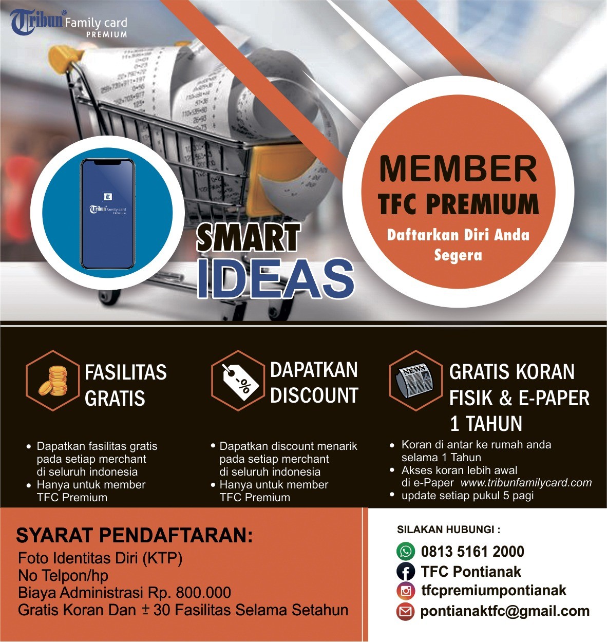 Info update merchant TFC Premium gratis dapat diakses melalui website www.tribunfamilycard.com atau ke WA 081351612000 atau langsung ke Kantor Tribun Pontianak Jalan Sungai Raya Dalam Nomor 24 A Pontianak.