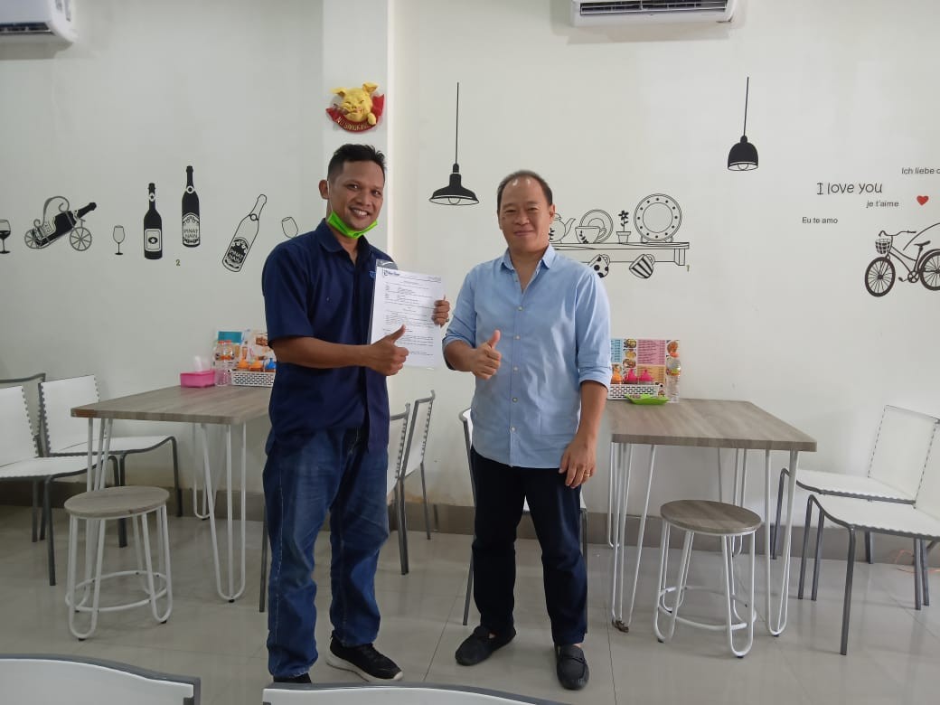 Pengendali Wilayah TFC Tribun Timur, WAKIDI DICKY NUGROHO (kiri) bersama Pemilik Lame-Lame Kafé, Ronny Wirawan (kanan) usai melakukan Memorandum of Understanding (MoU) untuk pengguna Aplikasi TFC di Lame-lame Kafe, Jl Tanjung Bunga Ruko Somba Opu Blok A 29 kota Makassar, Selasa (23/6/20).