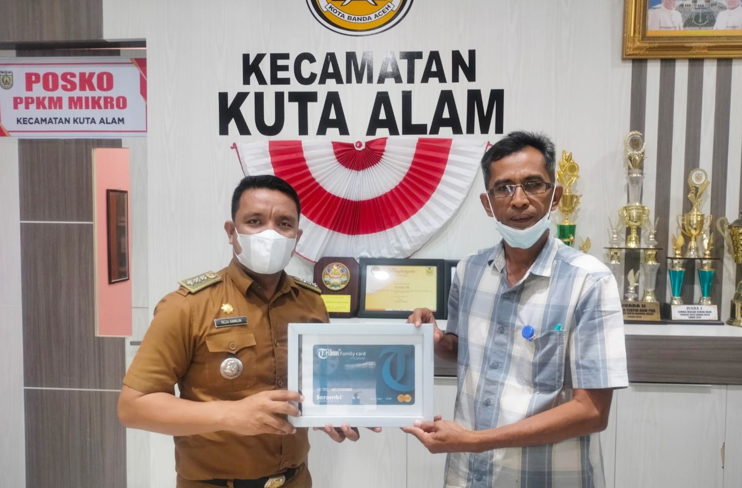 Camat Kuta Alam Kota Banda Aceh , Reza Kamilin, S.STP, (kiri) menerima Tribun Family Card (TFC) Premium Serambi Indonesia, Kartu serta User Id an Nam yang bersangkutan diserahkan oleh Syaiful Bahri, Manager Sirkulasi, sekaligus PIC Tribun Family Card. Penyerahn Acount User-Id tersebut dilakunan pada Senin (20/09/2021) di lobi Kantor Camat Kuta Alam.