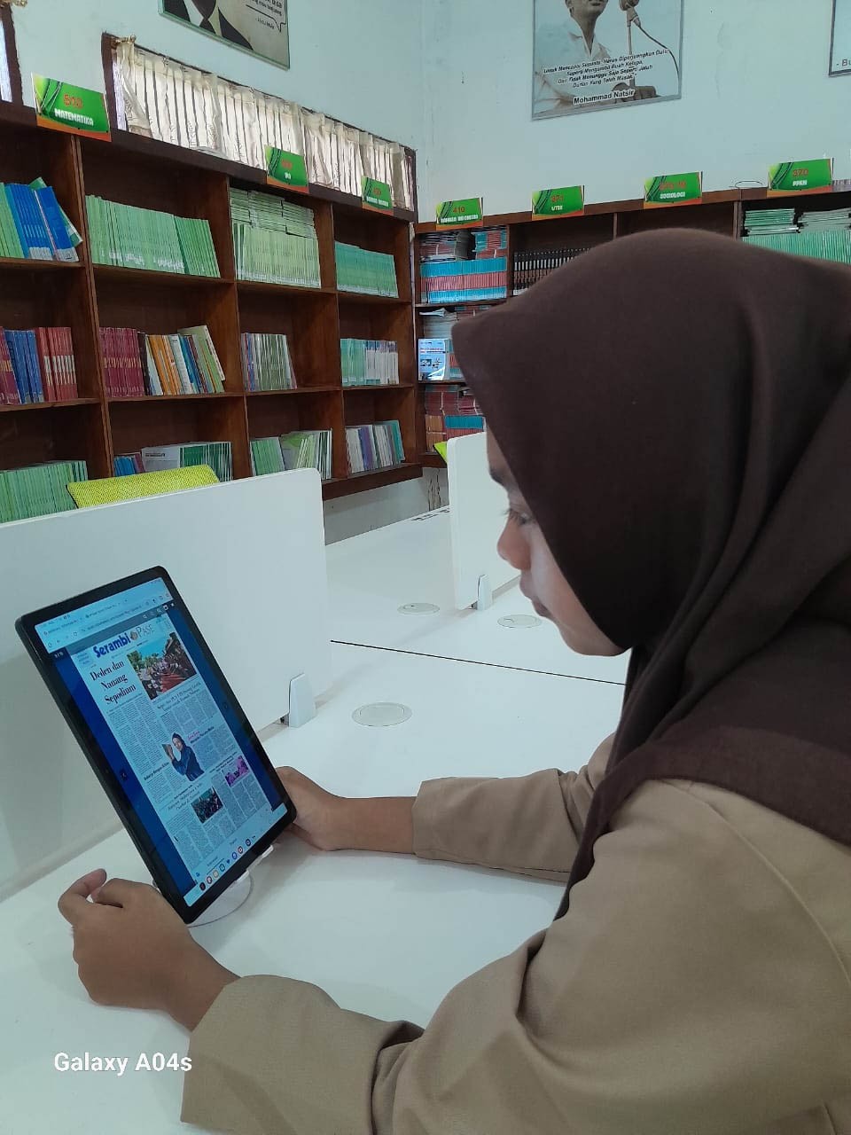 Salah seorang siswi SMA Negeri Matangkuli, Kabupaten Aceh Utara membaca edisi cetak Harian Serambi Indonesia dalam versi Digital yang sersedia dalam pojok baca Pustaka Digital Sekolah.